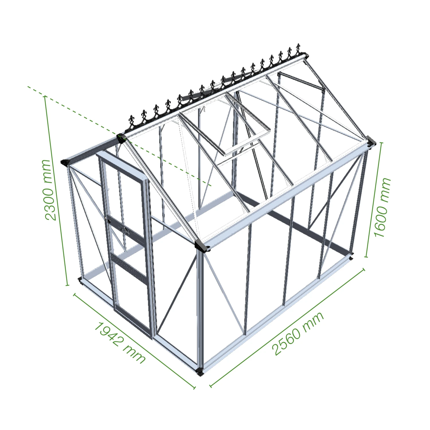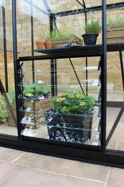 Zoekt u een ranke tuinkas met een flinke stahoogte? Kies dan voor de Burford. Deze vrijstaande kas wordt standaard uitgevoerd met een drempelloze enkele schuifdeur met slot. De schuifdeur is 65cm breed en heeft een hoogte van maar liefst 200cm. U gaat dus niet gebukt de kas in! Voor de extra brede goot met een breedte van 80mm worden gratis 2 regenpijpen met een diameter van 40mm meegeleverd. De Burford kas biedt keuze uit 2 soorten afdichting: 3 mm dik veiligheidsglas of 6 mm polycarbonaat. De afdichting wordt gefixeerd met kunststof beglazingsstrips. De voordelen per type afdichting op rij: Veiligheidsglas: geleverd in lange ruiten en tot 6 keer sterker dan tuindersglas. Polycarbonaat (dubbelwandig): licht van gewicht, onbreekbaar en heeft een beter isolerende werking dan glas. Het frame van de Burford is standaard leverbaar in een blanke uitvoering. Voor een meer luxueuze uitstraling en / of eenheid met de omgeving waarin de kas wordt geplaats is deze kas leverbaar in een zwarte of klassiek donkergroen gecoate uitvoering. Een goede beluchting is van levensbelang in de kas. Daarom is de Burford voorzien van 2 dakramen in model 66 + 86 en 4 dakramen in het grootste model; 106. Voor optimaal gebruiksgemak wordt het gebruik van een automatische raamopener geadviseerd. Deze raamopeners zijn temperatuurgevoelig en openen of sluiten het dakraam automatisch. Voor een stabiele en sterke basis is een funderingsrand noodzakelijk. De Burford wordt standaard (gratis) geleverd met een aluminium funderingsrand van 8cm hoog. Indien u kiest voor een zwart of donkergroen gecoate kas wordt ook de fundering in deze kleur meegeleverd.