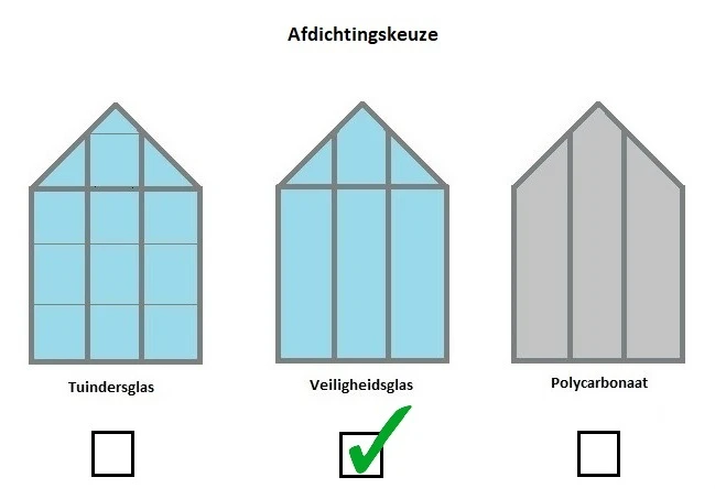 Tuindersglas is de goedkoopste optie maar kan door een dikte van 3mm sneller breken. Het laat 90% van het licht door, waardoor de planten en kruiden in jouw kweekkas goed kunnen groeien. Veiligheidsglas is tot zes keer sterker en zal veel minder snel breken. Wanneer het wel breekt, valt het uiteen in botte delen waardoor dit glas een stuk veiliger is. Ook veiligheidsglas laat ongeveer 90% van het licht door in de tuinkas. Polycarbonaat is als enige niet transparant en laat minder licht door. Planten die snel verbranden voelen zich daardoor erg thuis in een tuinkas van polycarbonaat. Het breekt veel minder snel dan glas en heeft een goed isolerende functie.